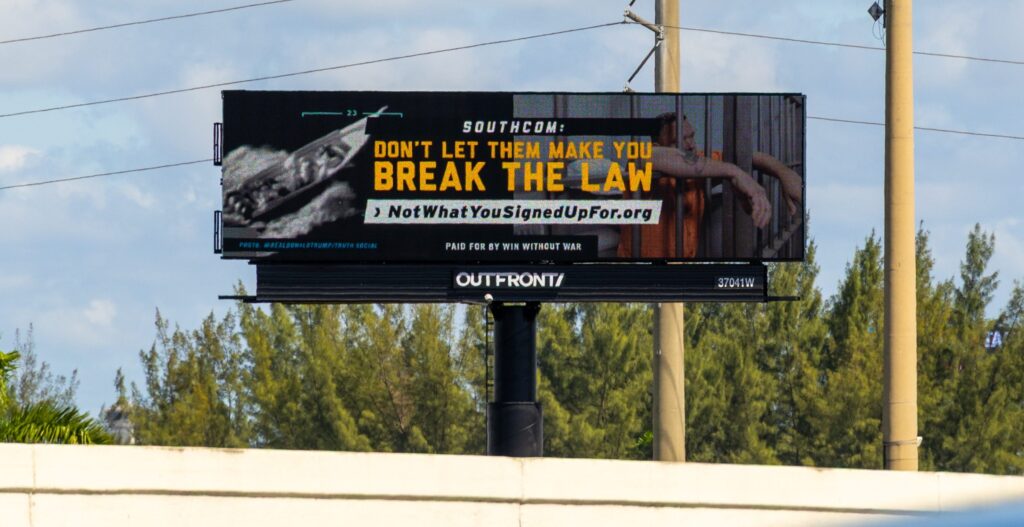 Billboards outside US Southern Command urge troops not to ‘break the law’ in Caribbean strikes